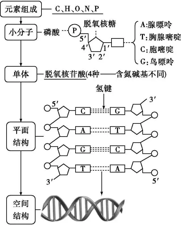 ③内侧:两条链上的碱基通过氢键连接成碱基对。碱基互补配对遵循以下原则:A与T配对(两个氢键)、G与C配对(三个氢键)。