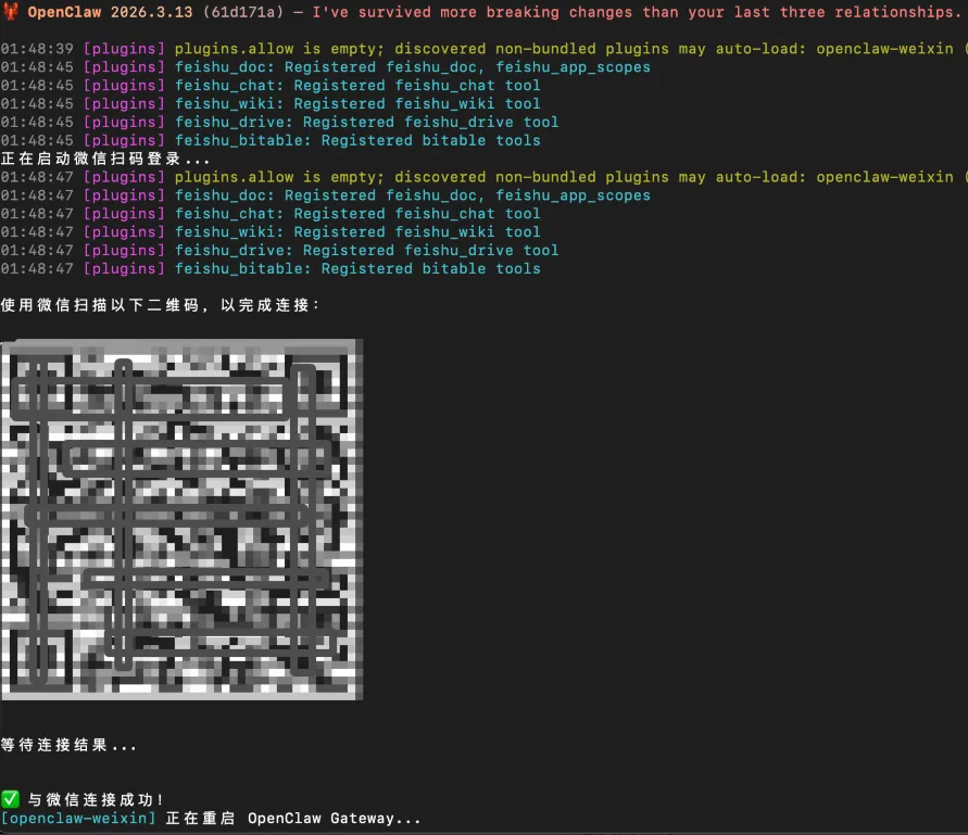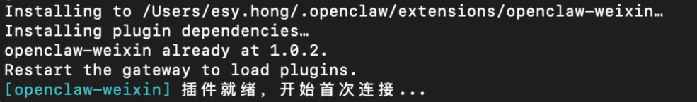 安装完成后,命令行会显示1.0.2版本已经准备完成,openclaw会自动重启网关加载插件。