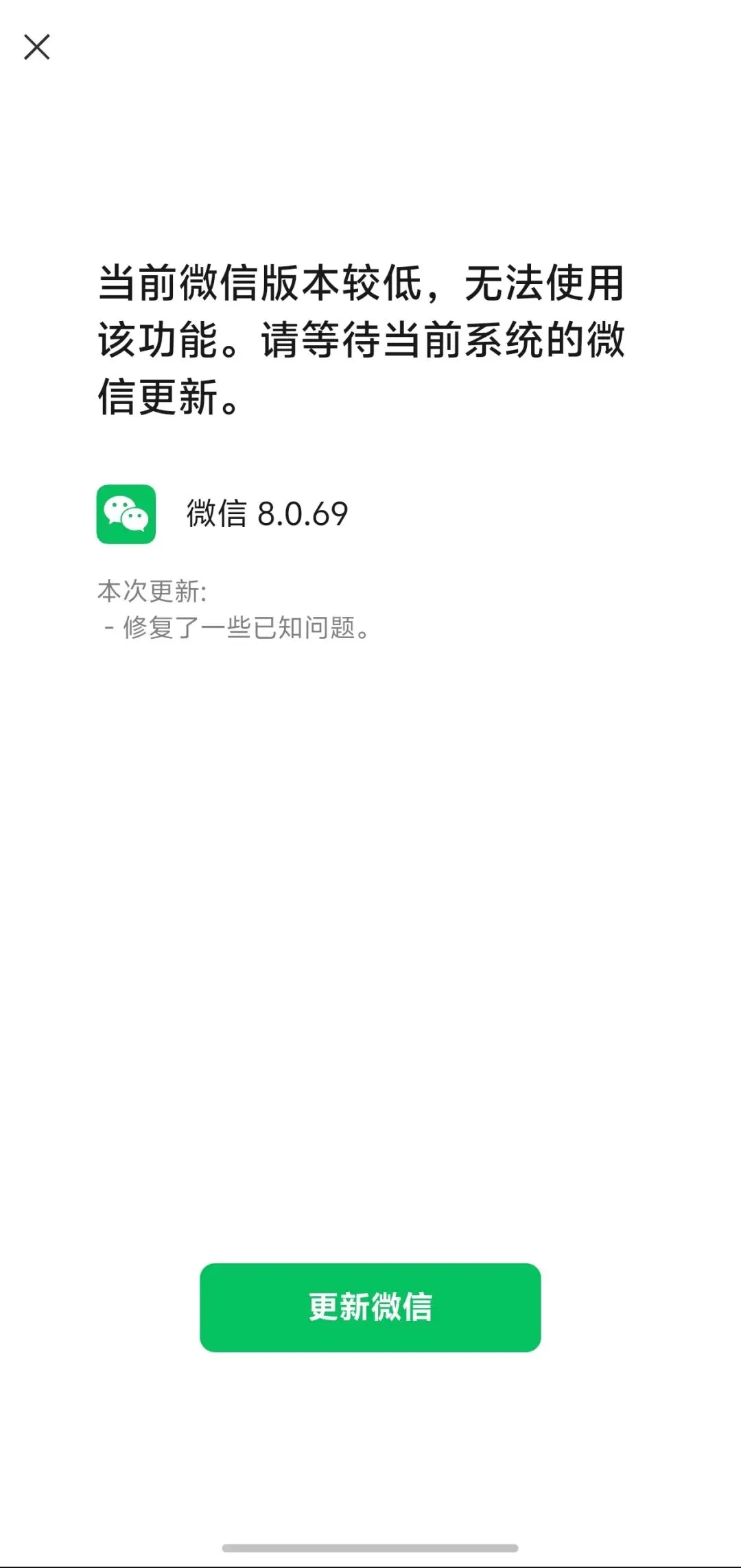 部分机型的微信可能没有推送最新版app更新,通过这个方式可以直接呼出app更新入口。