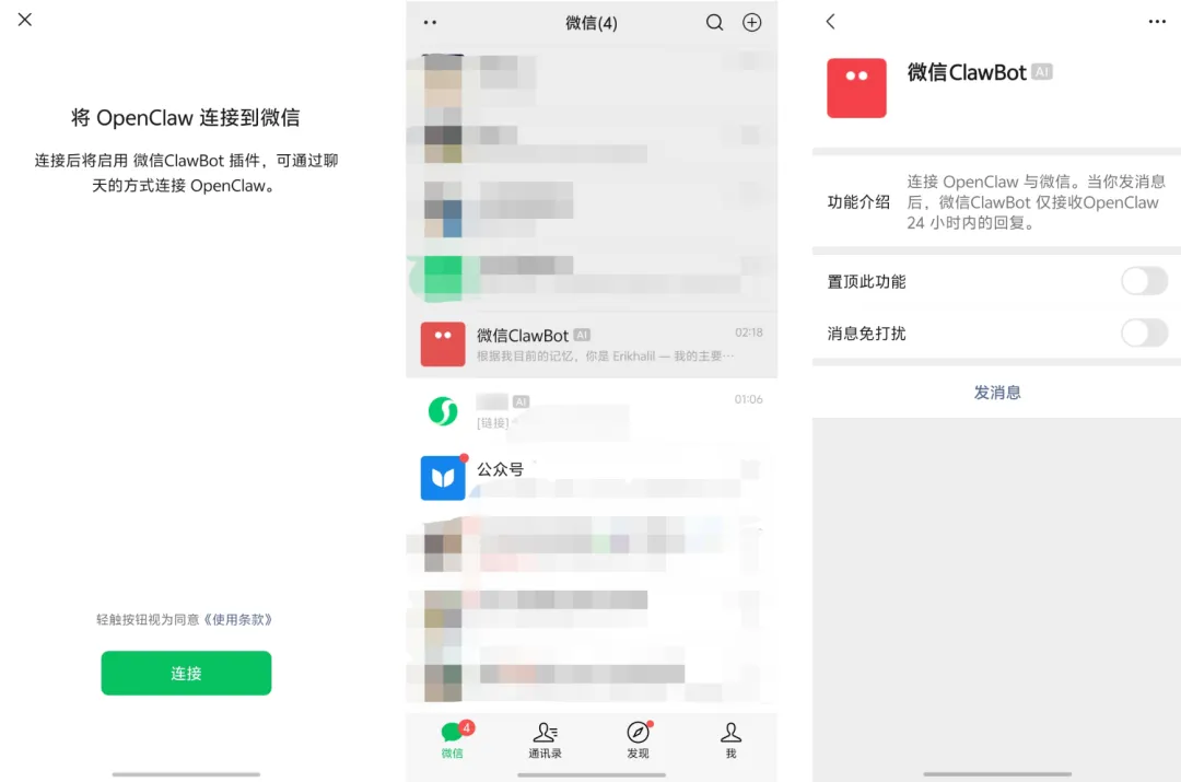 微信更新完毕,点击【连接】,你的龙虾就住进你的微信列表啦。