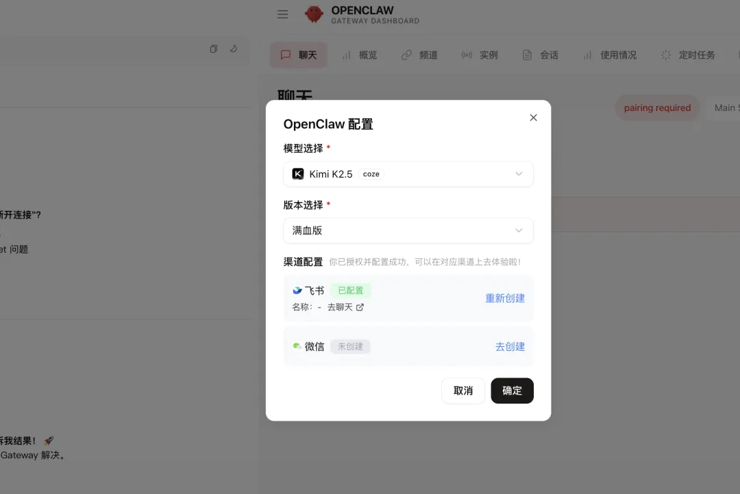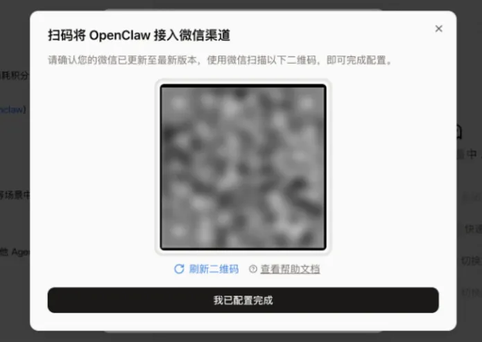 进入【OpenClaw配置】窗口,点击微信渠道右侧创建按钮,