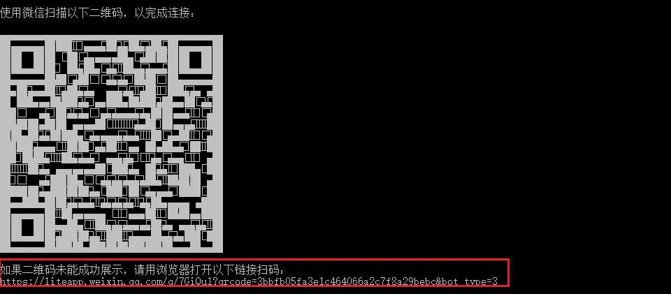 此时,可以看到“使用微信扫描以下二维码,以完成连接”(注意:这个二维码无法扫描成功,需要把红框的链接复制到浏览器中打开)