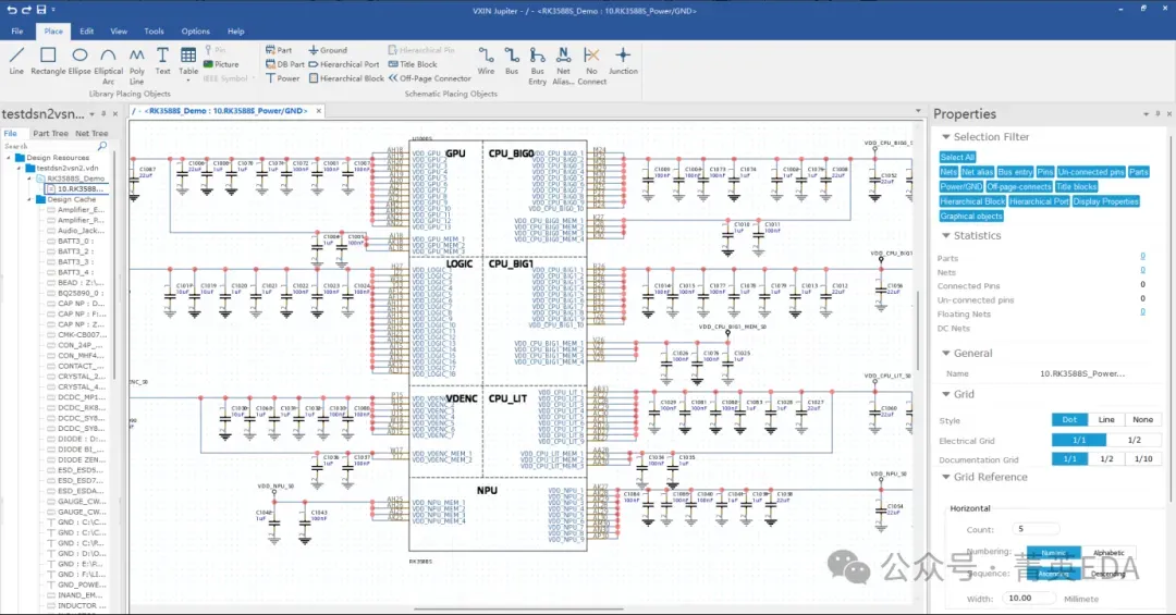 这是Jupiter原理图设计工具的界面,它继承了主流EDA工具的使用习惯,与PLM系统无缝集成,确保原理图、PCB、BOM等图文档的一致性。