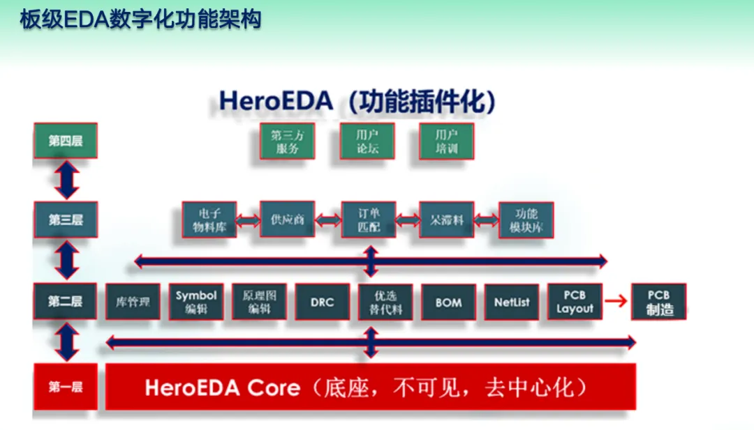 罗晶还展示了原理图的技术架构。其中包括了设计模型、数据模型、原理图画图的算法、物料清单的管理。他表示,物料清单管理可以用API接口跟元器件电商,包括器件管理跟数据库的连通,PCB设计打通与PCB制造、贴片厂进行沟通,从而实现作为一个电子设计与制造业的入口的形态。
