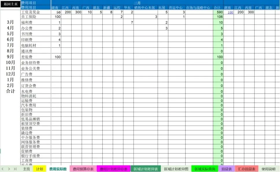 多维度费用预算分析神器,支持按区域、部门、费用项目、月份精细化统计,含预算总表、计划差异表、区域差异图 / 表、汇总损益表,自动对比计划数与实际数,可视化展示费用差异,预算管控、分析一目了然。