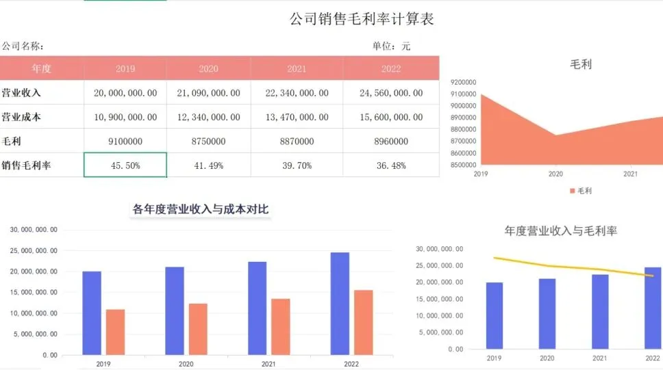 带动态可视化图表的毛利分析表,自动统计年度营业收入、营业成本,一键算出销售毛利率,配套营收成本对比图、毛利率趋势图,企业盈利水平、毛利变化一眼洞悉,数据汇报更有说服力。
