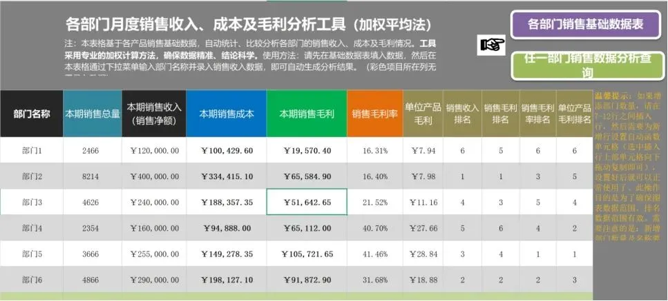 专业加权平均法分析表,录入销售基础数据,自动计算各部门营收、成本、毛利、毛利率,实现毛利 / 毛利率双排名,支持新增部门自定义设置,精准分析各部门盈利能力,为业务决策提供硬核数据支撑。