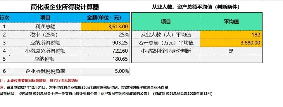 贴合小微企业税收政策的专属计算表,仅需填写标黄核心数据,自动计算应纳所得税额,自带小型微利企业身份判断(从业人数、资产总额平均值自动校验),精准享受小微减免政策,自动算出企业所得税税负率,税务核算省时又精准。
