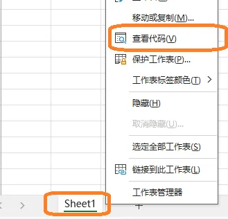 右键点击底部的工作表标签(如 Sheet1)→ 查看代码