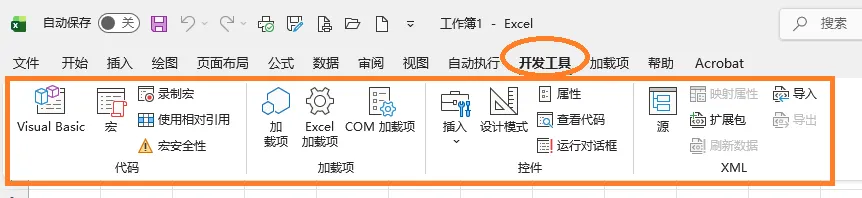 开启后,「开发工具」选项卡包含以下核心功能区: