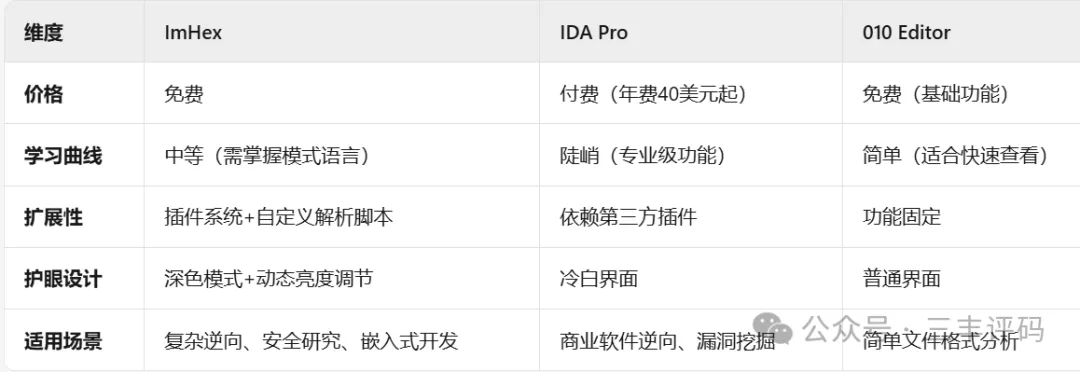 – 对比传统工具(如IDA Pro、010 Editor)的冷白界面,ImHex的视觉友好性显著提升。