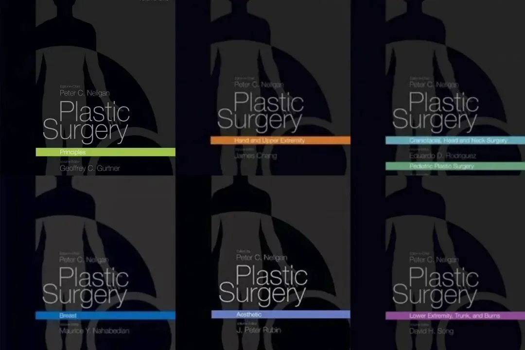 整形外科权威专业丛书《Plastic Surgery》(《整形外科》),由Peter C. Neligan担任总主编,这套书按整形外科的细分方向分卷编写,图中展示了6个不同分册,分别对应:原则、手与上肢、颅面头颈与小儿整形外科、乳房、整形美容、下肢躯干与烧伤领域,是整形外科领域经典的专业参考著作。