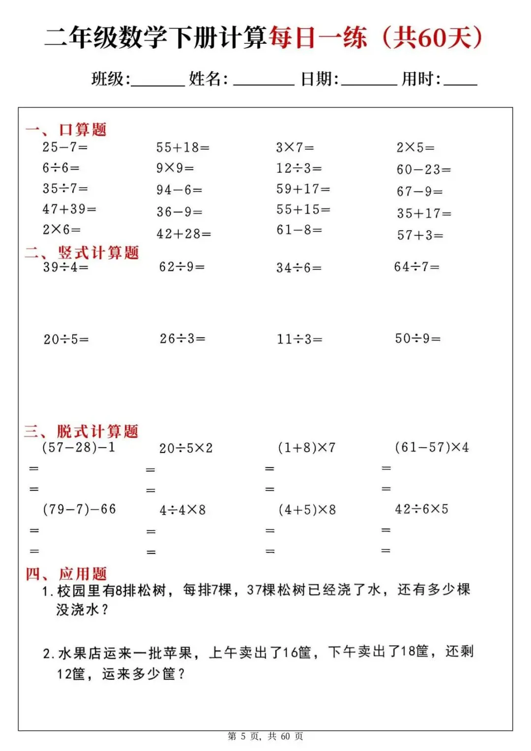 今天给大家分享的是:二年级(下)数学 计算每日一练,共60页,电子版可下载打印。文章末尾可直接领取全套电子版,无套路,欢迎收藏和下载。如果觉得这份资料不错,建议分享到班级群/年级群,让其他家长打印出来,帮助孩子学习;如果觉得合适,请支持正版!