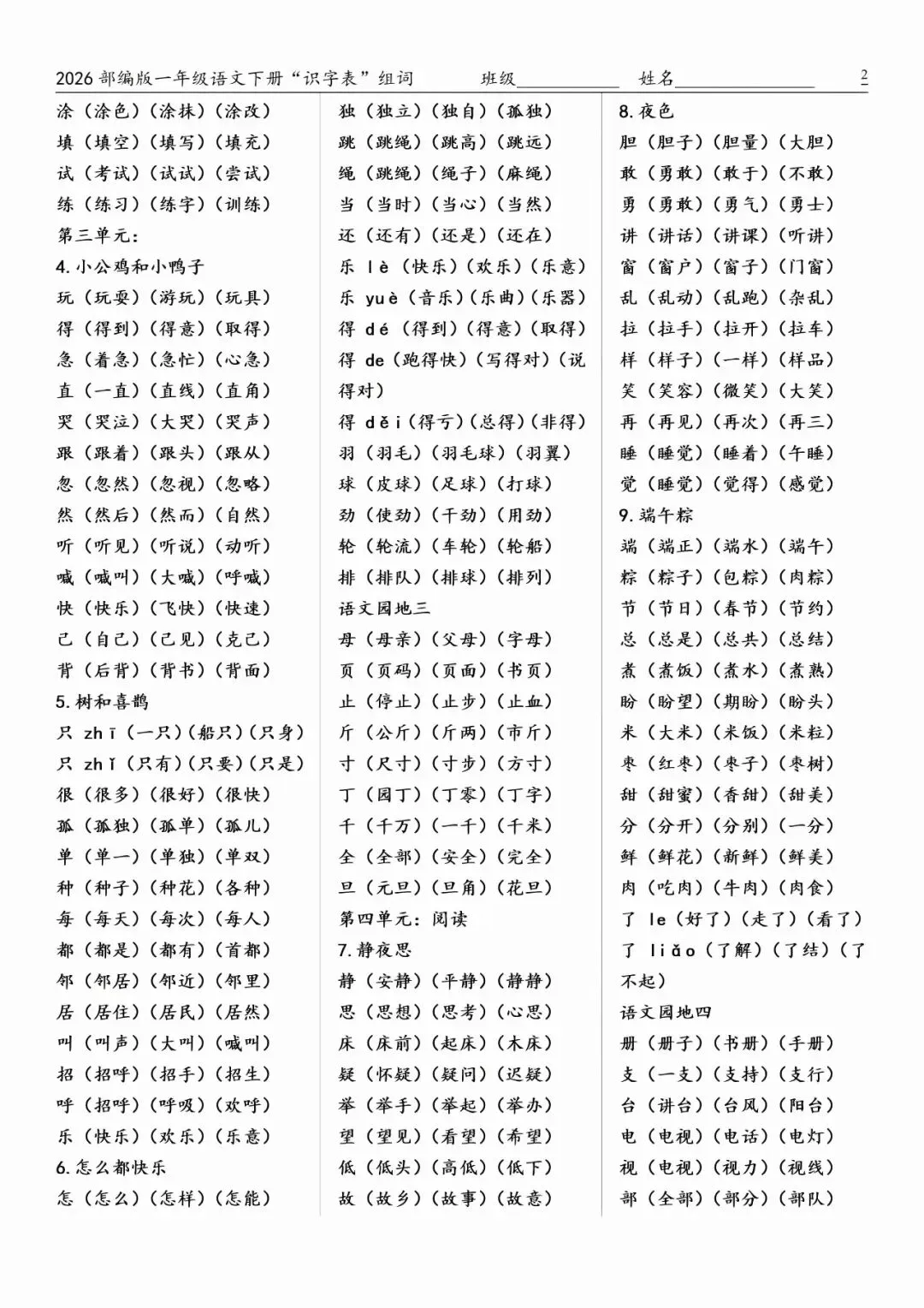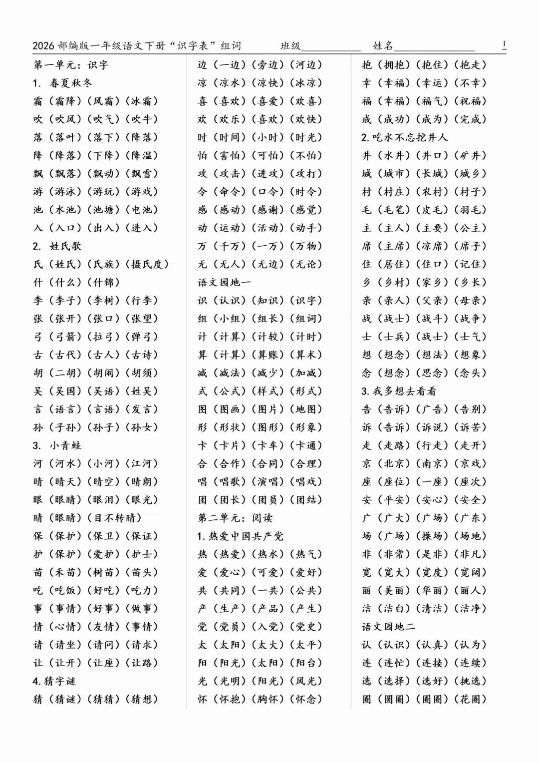 一年级下册语文识字表组词,PDF电子版,可下载打印