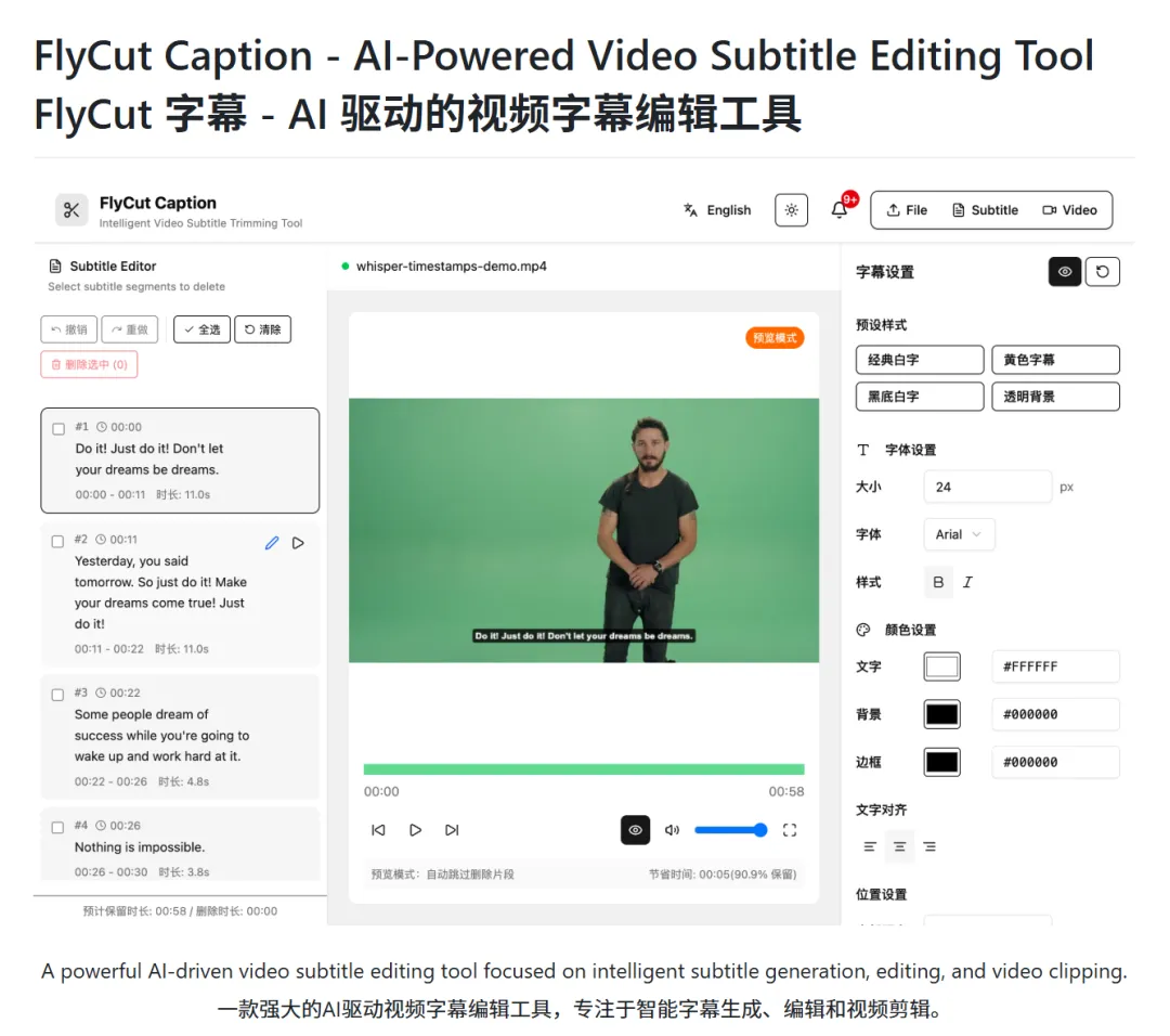 FlyCut Caption 是一个AI驱动的视频字幕编辑工具,基于 OpenAI 的 Whisper 模型做语音识别。
