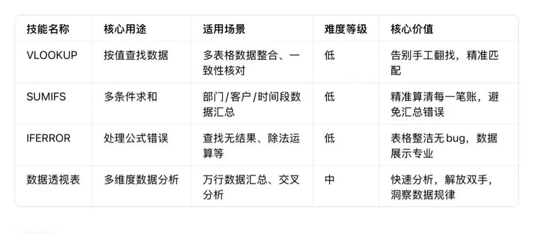 这4个核心技能,覆盖了财务日常工作的查找、汇总、错误处理、数据分析全场景,从新手到进阶,循序渐进学习,很快就能实现“工作效率翻倍”。