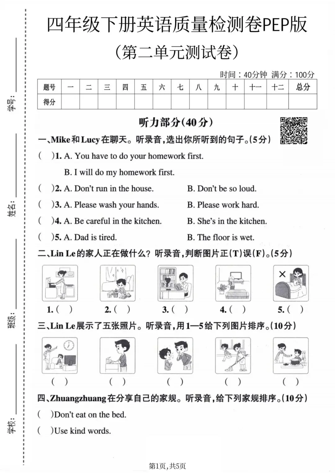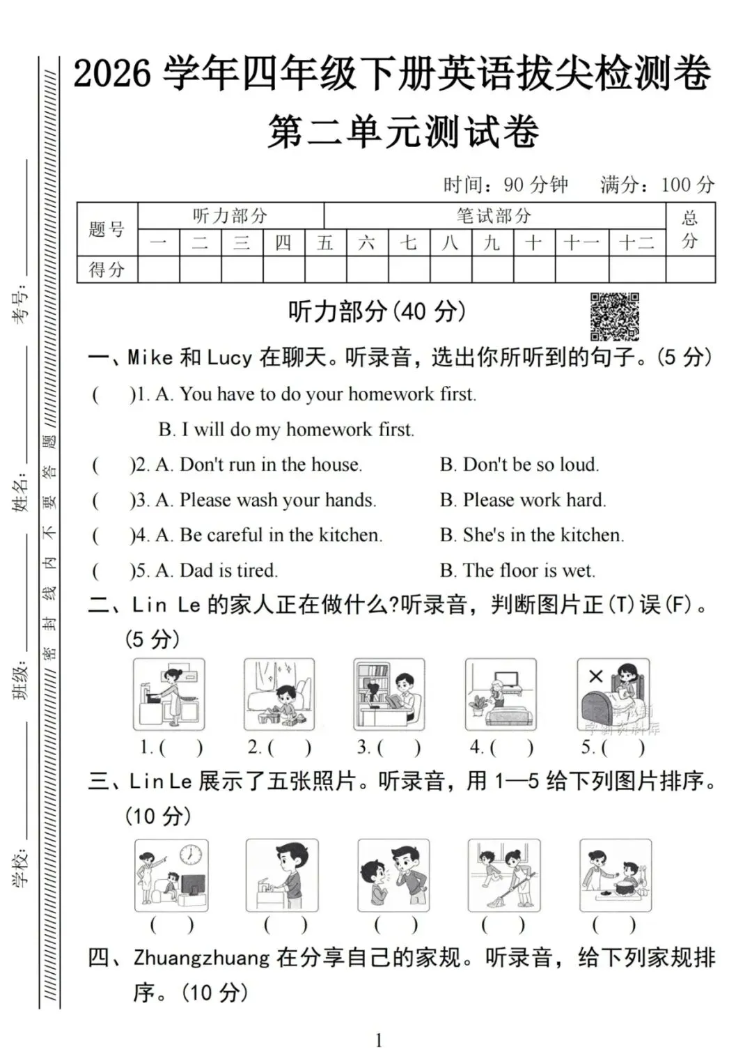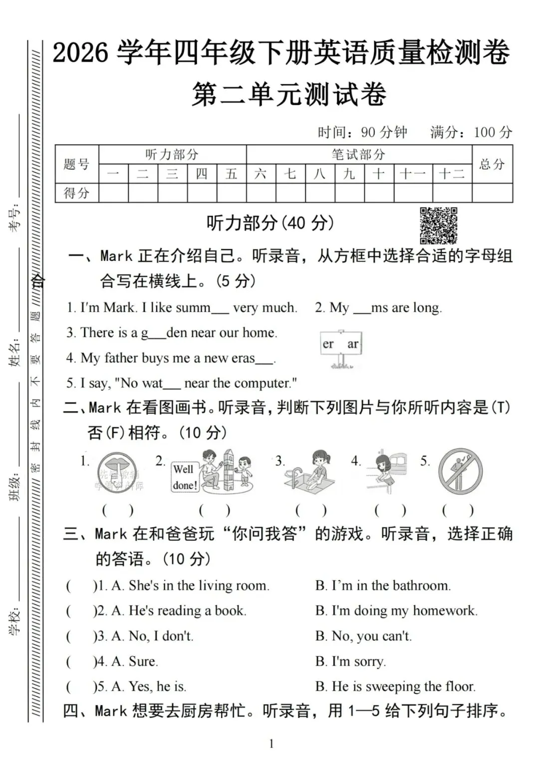 🌟2026春新版四年级下册人教PEP版英语,第二单元检测试卷3套,有答案,含听力音频,电子版可下载打印。这3套试卷紧扣四年级下册第二单元知识点,含质量卷、提升卷,覆盖听力、填空、选择、阅读、写作题等,提前帮孩子检测学习成果,查漏补缺再巩固提高,需要的家长老师抓紧领回去,给孩子查漏补缺吧💪!