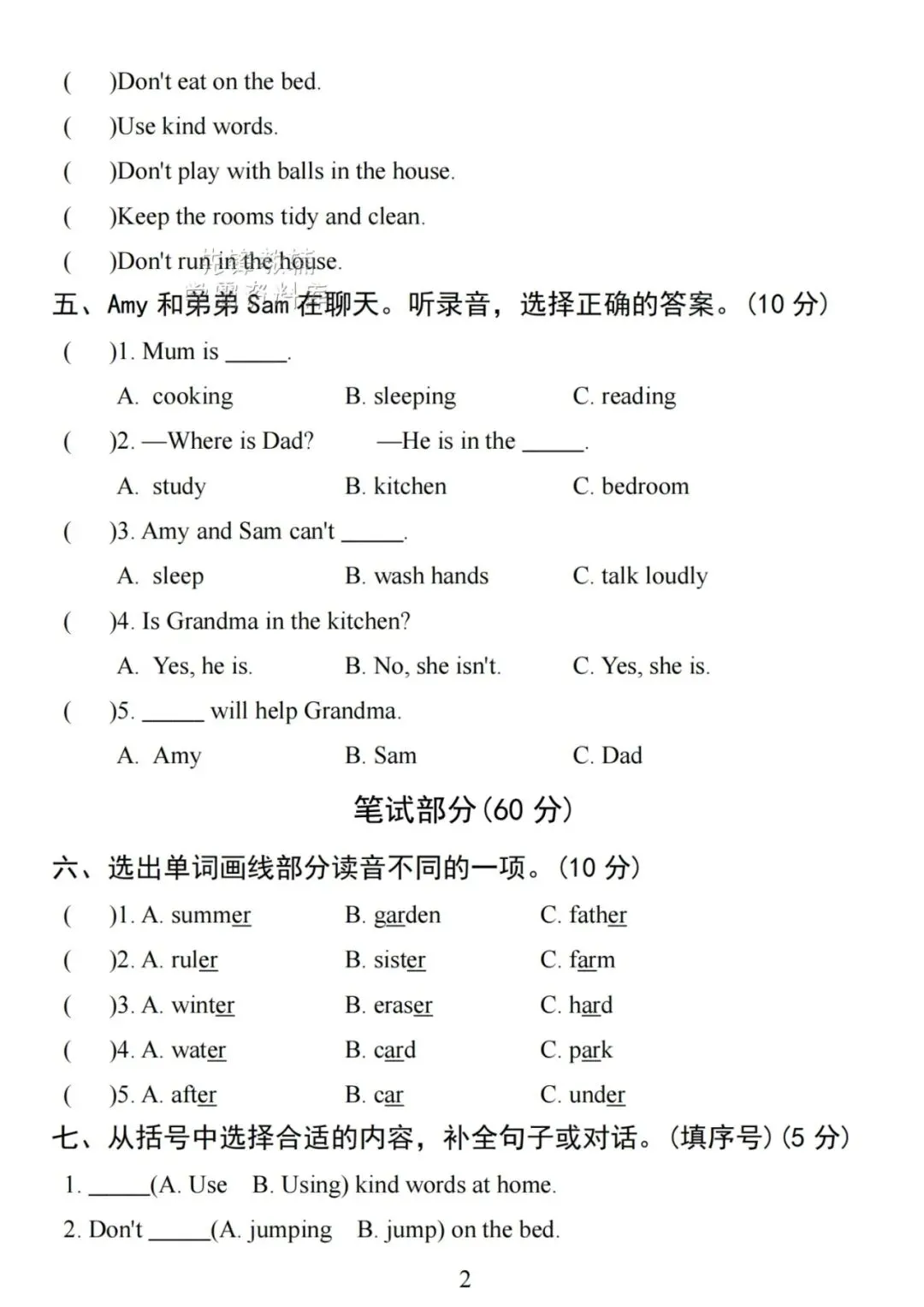 2026春新版四年级下册人教PEP版英语《第二单元检测试卷3套》(有答案 含听力音频),可打印