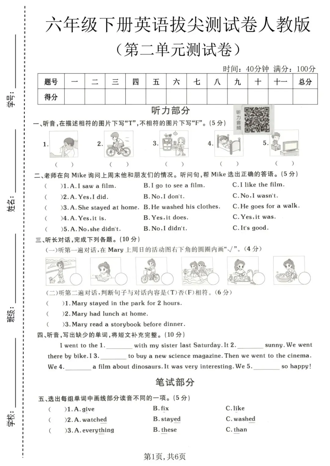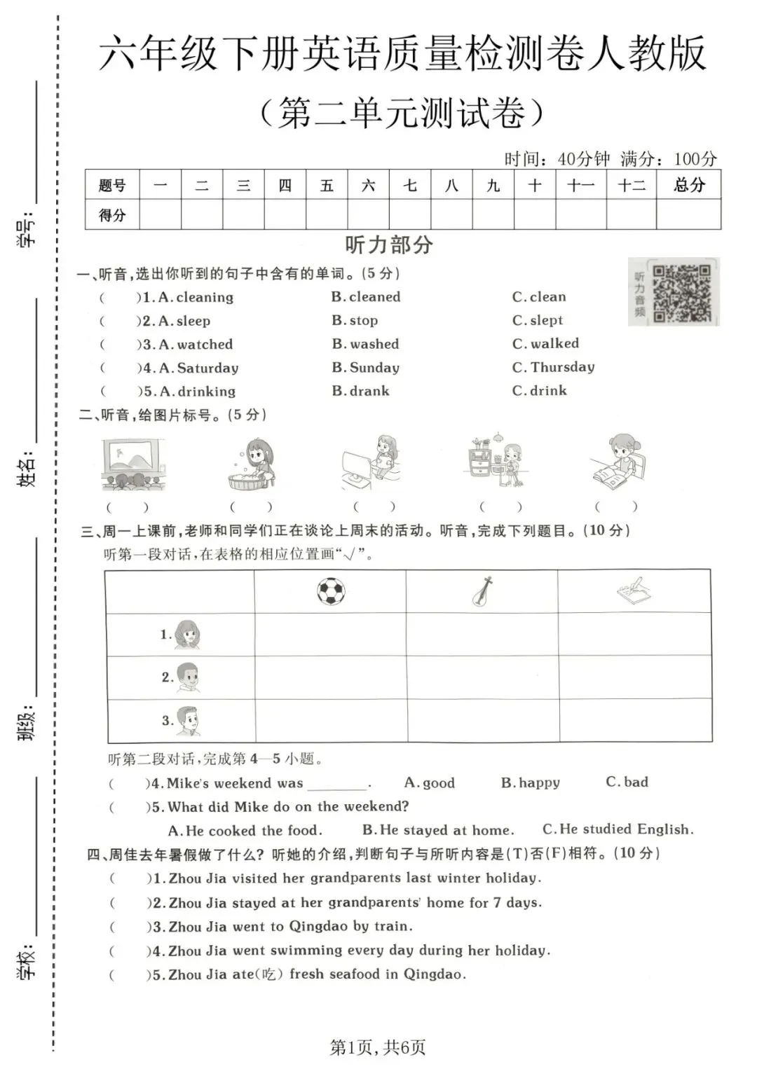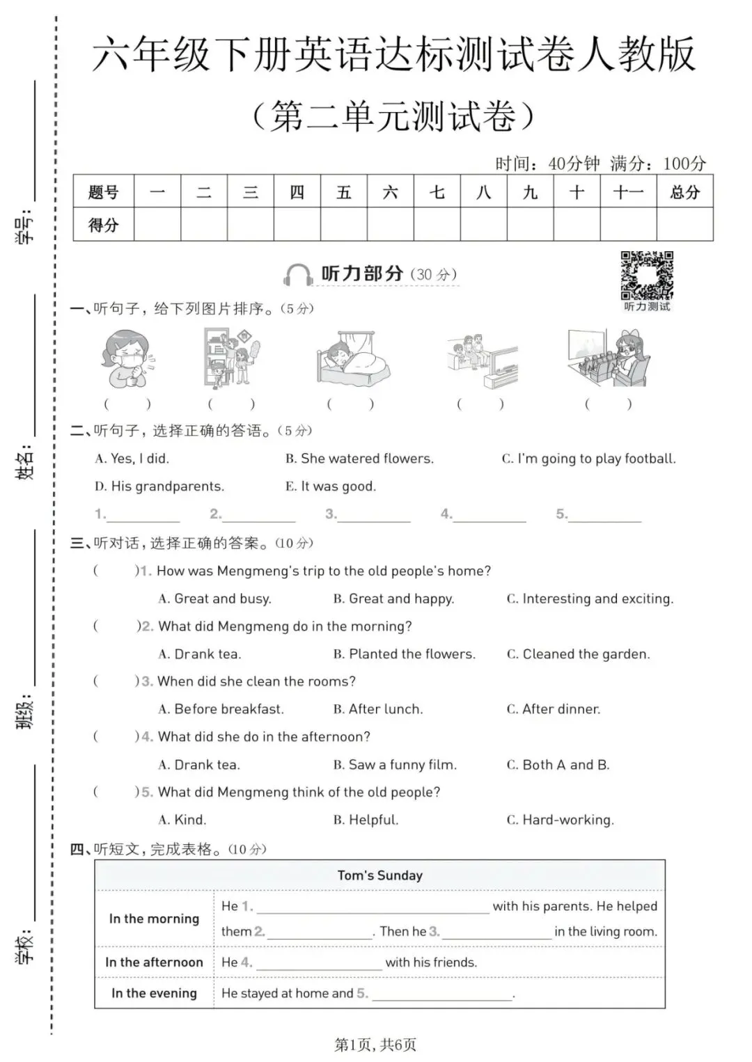 2026春新版六年级下册人教PEP版英语《第二单元检测试卷3套》(有答案 含听力音频),可打印
