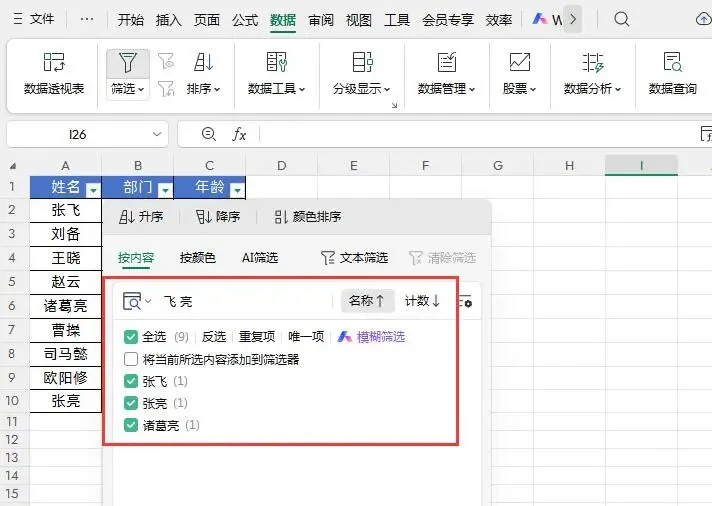 如下图所示,我们要对筛选姓名中带“飞”和“亮”字的信息。