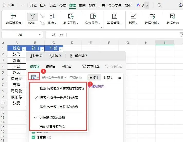 第二步:然后点击【姓名】右下角的灰色折叠符展开筛选详情→在默认的【按内容】的筛选框中先输入第一个关键词:飞→然后按一下空格,再次输入另一个关键词:亮