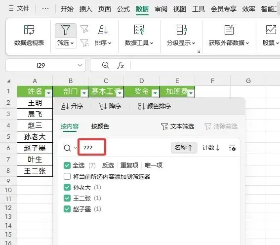 第二步、点击【姓名】右下角的灰色折叠符展开筛选详情→在默认的【按内容】的筛选框中输入:???(备注:英文状态的问号,1个问号代表1个字符)