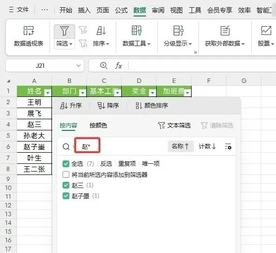 点击【姓名】右下角的灰色折叠符展开筛选详情→在默认的【按内容】的筛选框中输入:赵*(备注:英文状态星号,1个*代表0个或多个任意字符)