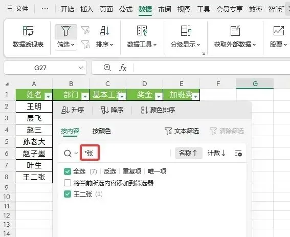 点击【姓名】右下角的灰色折叠符展开筛选详情→在默认的【按内容】的筛选框中输入:*张(备注:英文状态问号,1个*代表0个或多个任意字符)