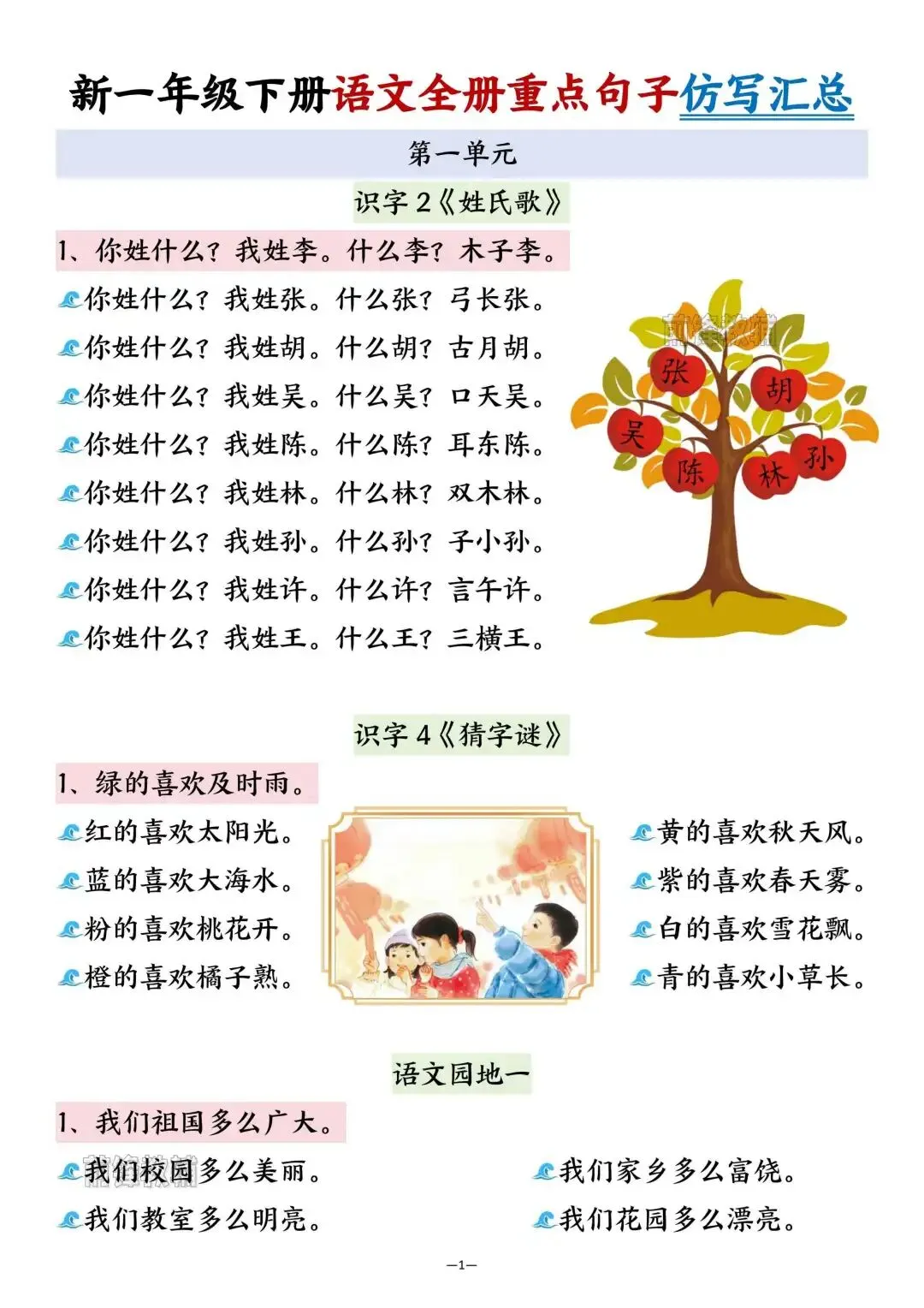 26新一年级下册语文(全册重点句子仿写(电子版可打印)