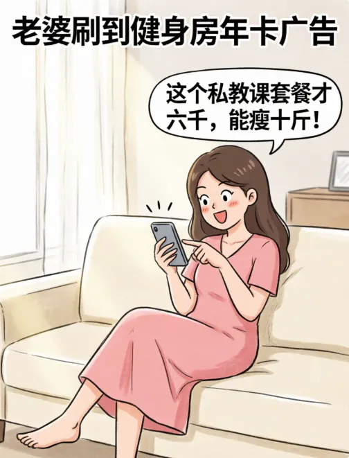 趣味漫画:一女子刷到健身房年卡广告:这个私教课套餐才六千,能瘦十斤!老公掐指一算:相当于你每天少买一杯咖啡