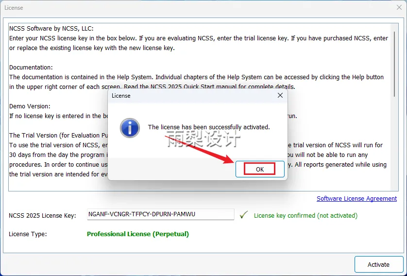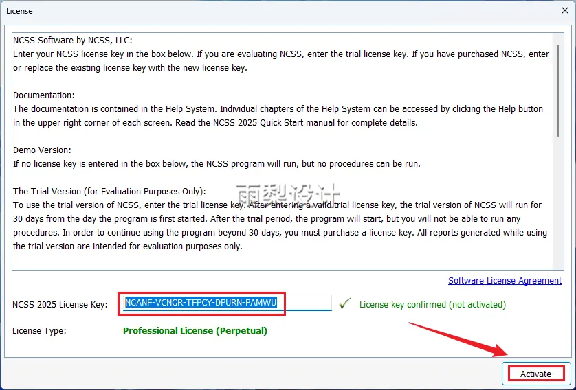 17.NCSS 2025 License Key后面框里【Ctrl+V粘贴】;点击【Activate】