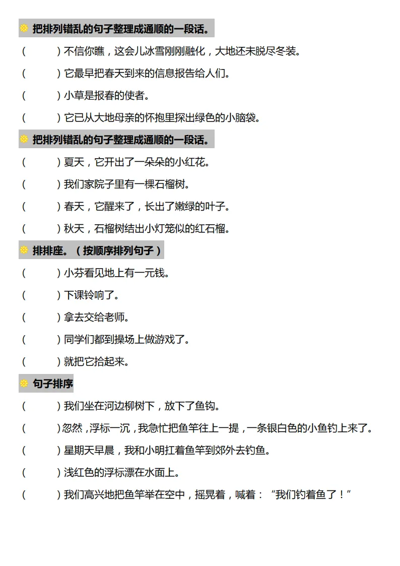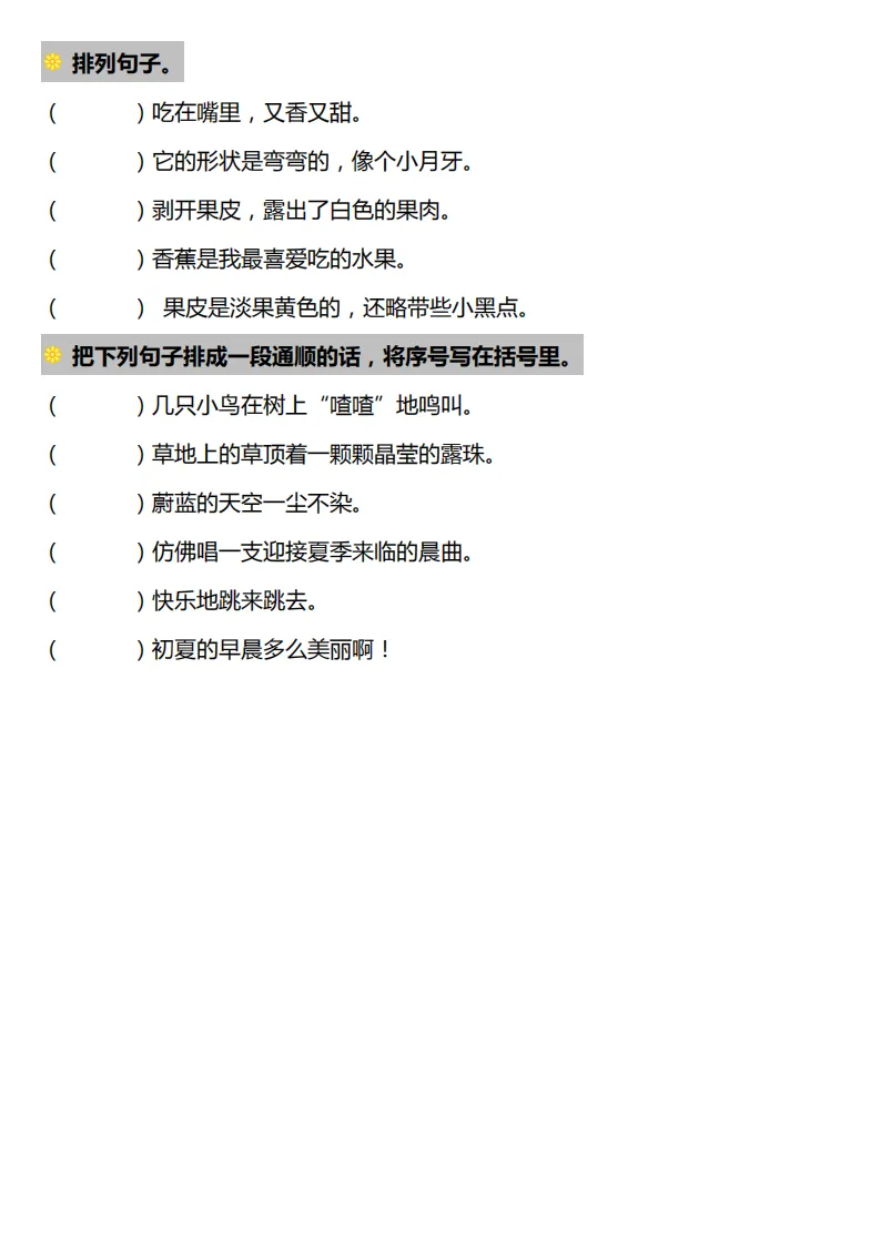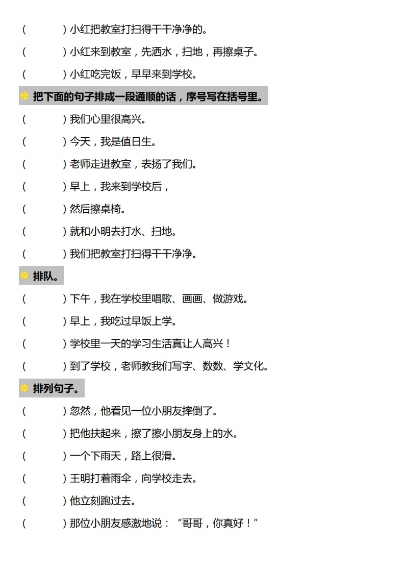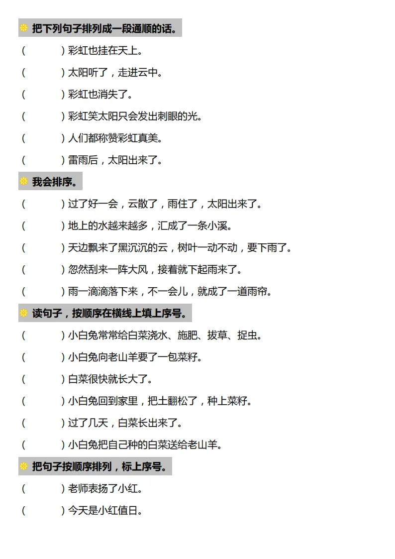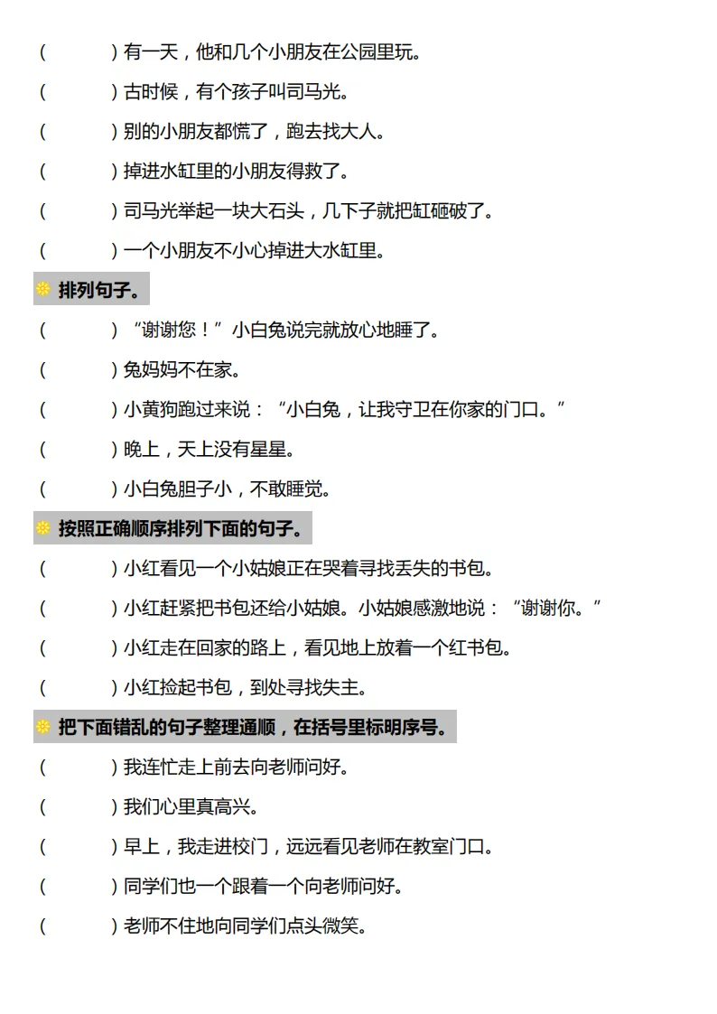 一年级孩子句子排序总混乱?逻辑不清、不会找顺序?这份专项练习太实用!精选生活场景、简单故事类排序题,附解题思路,引导孩子理清逻辑、找关键词。每天 2 道题,帮孩子掌握排序技巧,提升语言组织能力~