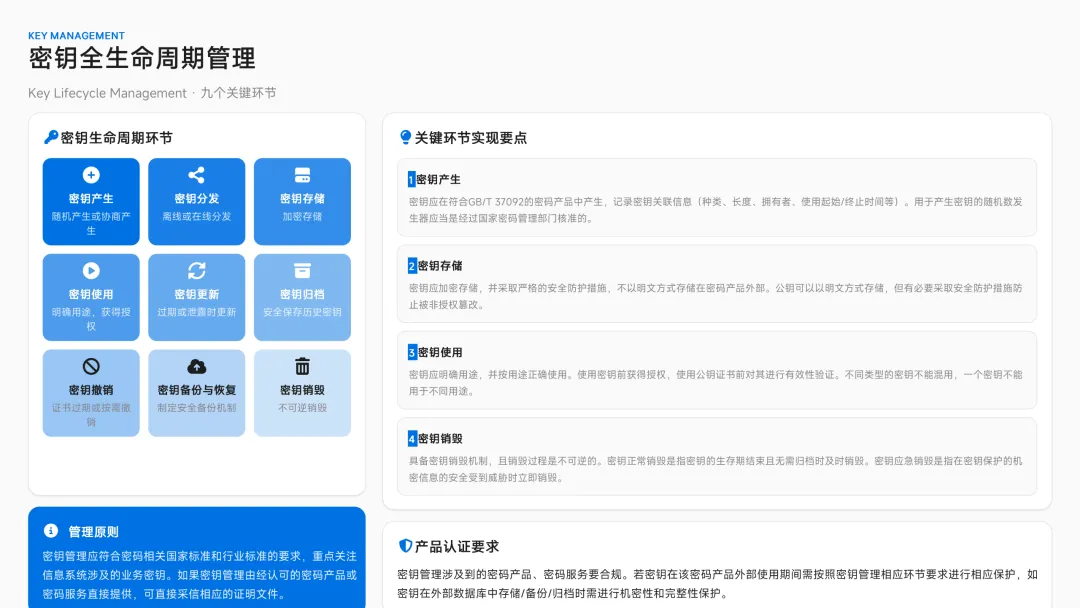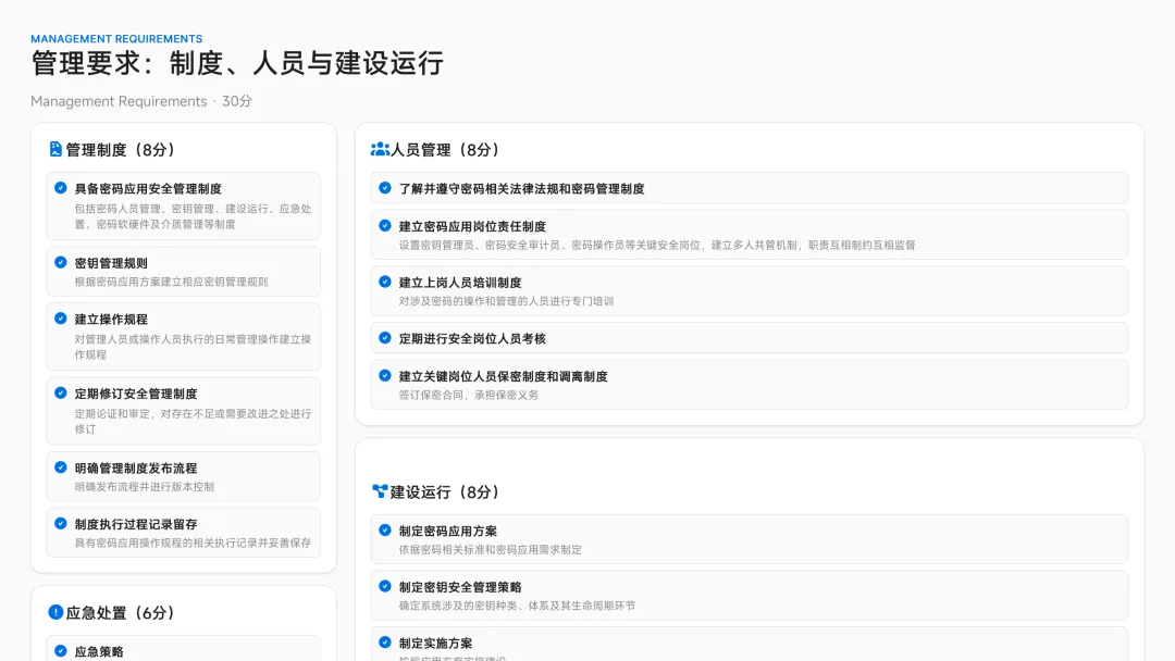 管理制度:建立密码应用管理制度、密钥管理、审计、应急等制度。