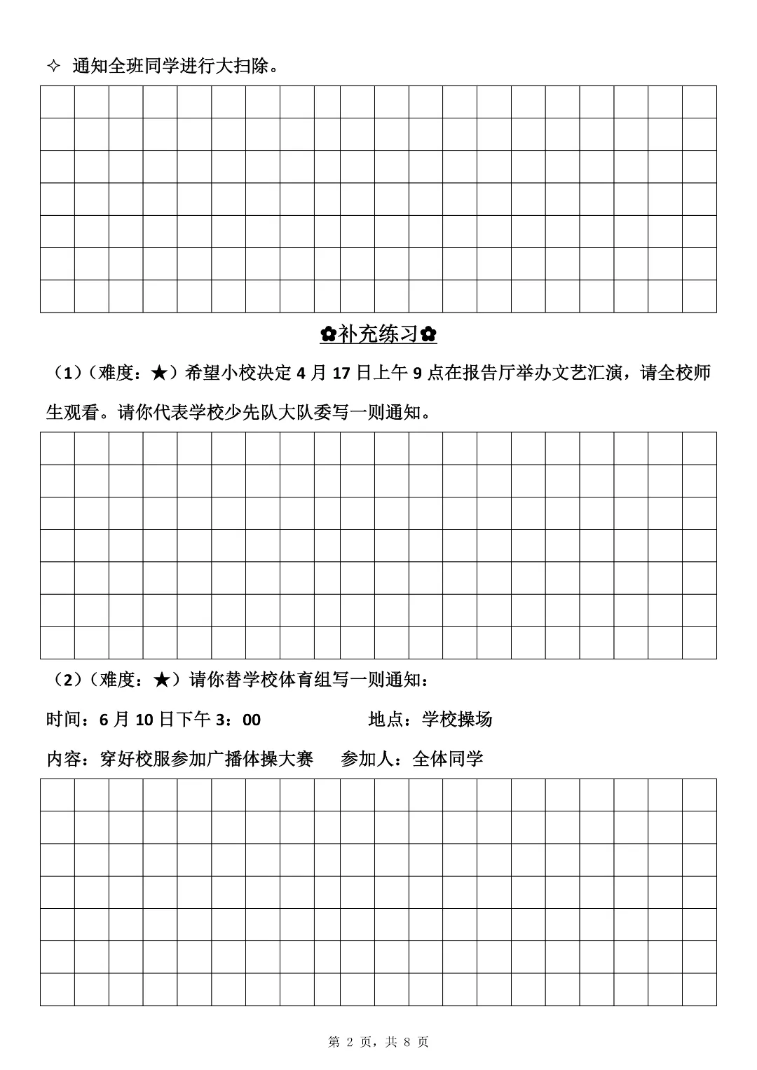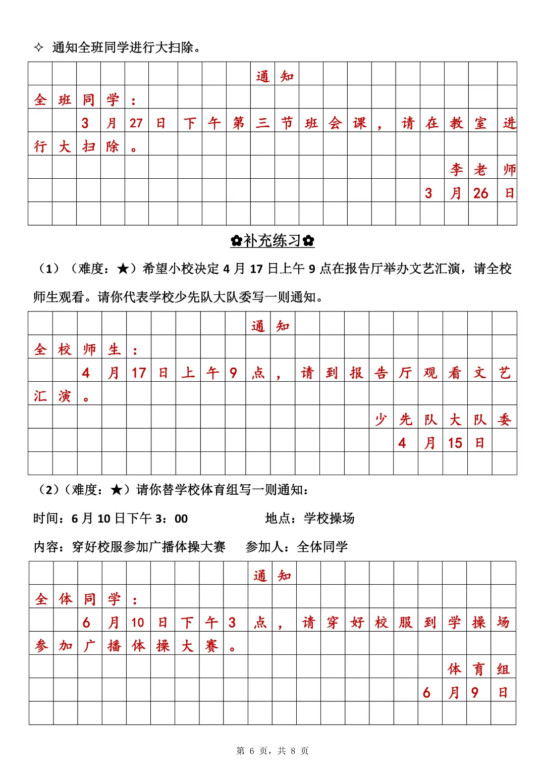 26年三年级下册语文《通知专项练习》,含答案共8页,电子版可下载,通过这份三年级下册语文通知专项练习题,帮助孩子熟练掌握标题、称呼、正文、落款的标准写法,同时学会准确提取时间、地点、事件等关键信息,为今后的日常交流和写作表达奠定基础。需要的家长抓紧打印出来,让孩子练一练吧。