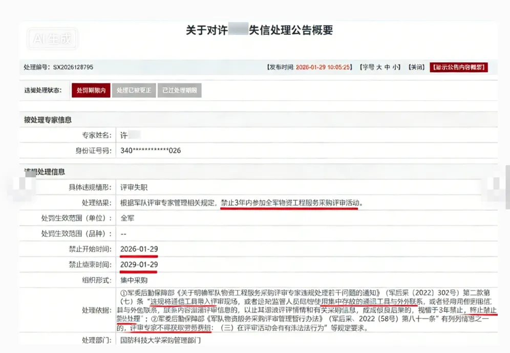 最终监管部门依据当地专家库管理办法,作出处罚:3年内取消其评标专家资格,列入严重失信名单不得参与任何依法必须招标项目的评标活动,同时记入个人履职信用档案。