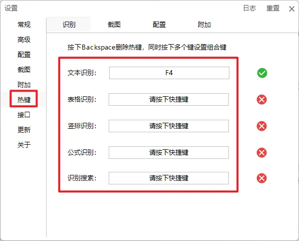 右键点击系统托盘的天若OCR图标,选择“设置”,在弹出的窗口中,找到“热键设置”,将“截图识别”的快捷键(默认F4)改为自己习惯的组合键(如Ctrl+Shift+F),避免与输入法、浏览器等软件冲突,修改后点击“确定”即可生效