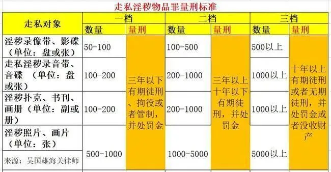 3、根据《刑法》第一百五十二条、《最高人民法院、最高人民检察院关于办理走私刑事案件适用法律若干问题的解释》第十三条,走私淫秽书籍超过50册的就有可能被追究走私淫秽物品罪。具体量刑见下表: