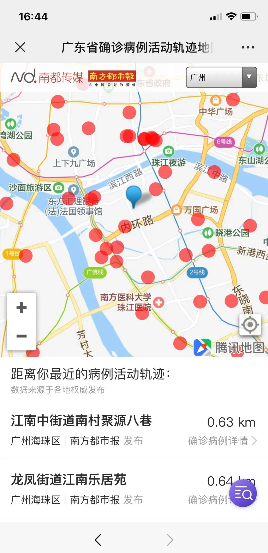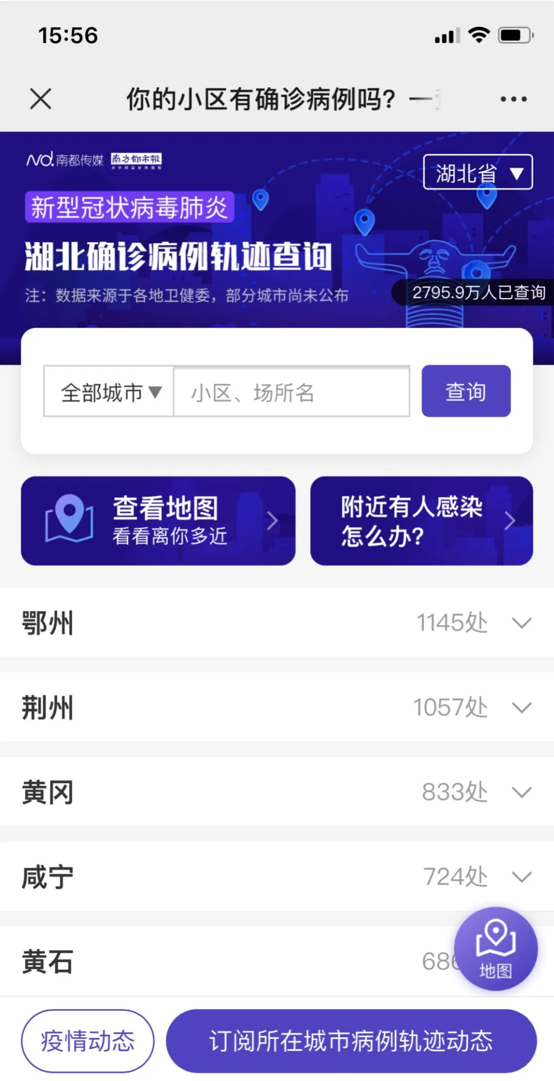 日前,南方都市报上线了“全国确诊病例轨迹查询平台”工具,点击“你的小区有确诊病例吗?一查就知”的链接,就能进入查询界面,不仅可以通过关键词搜索的方式查询,还可以通过地图查看的方式,更直观、更清晰。