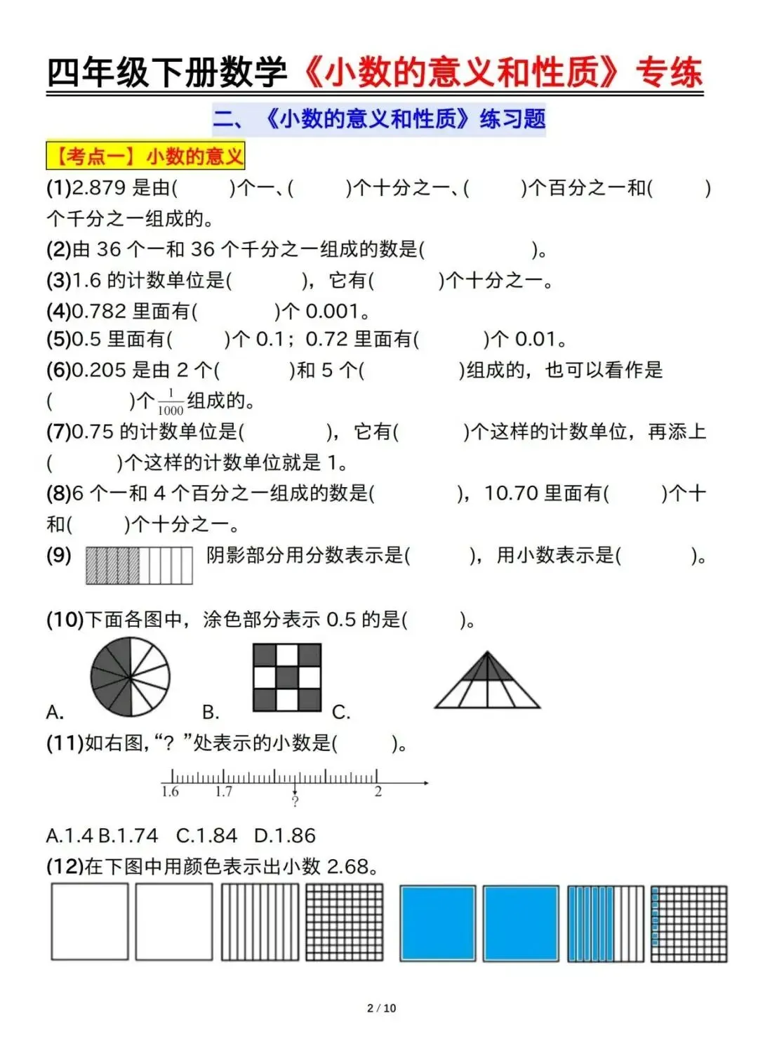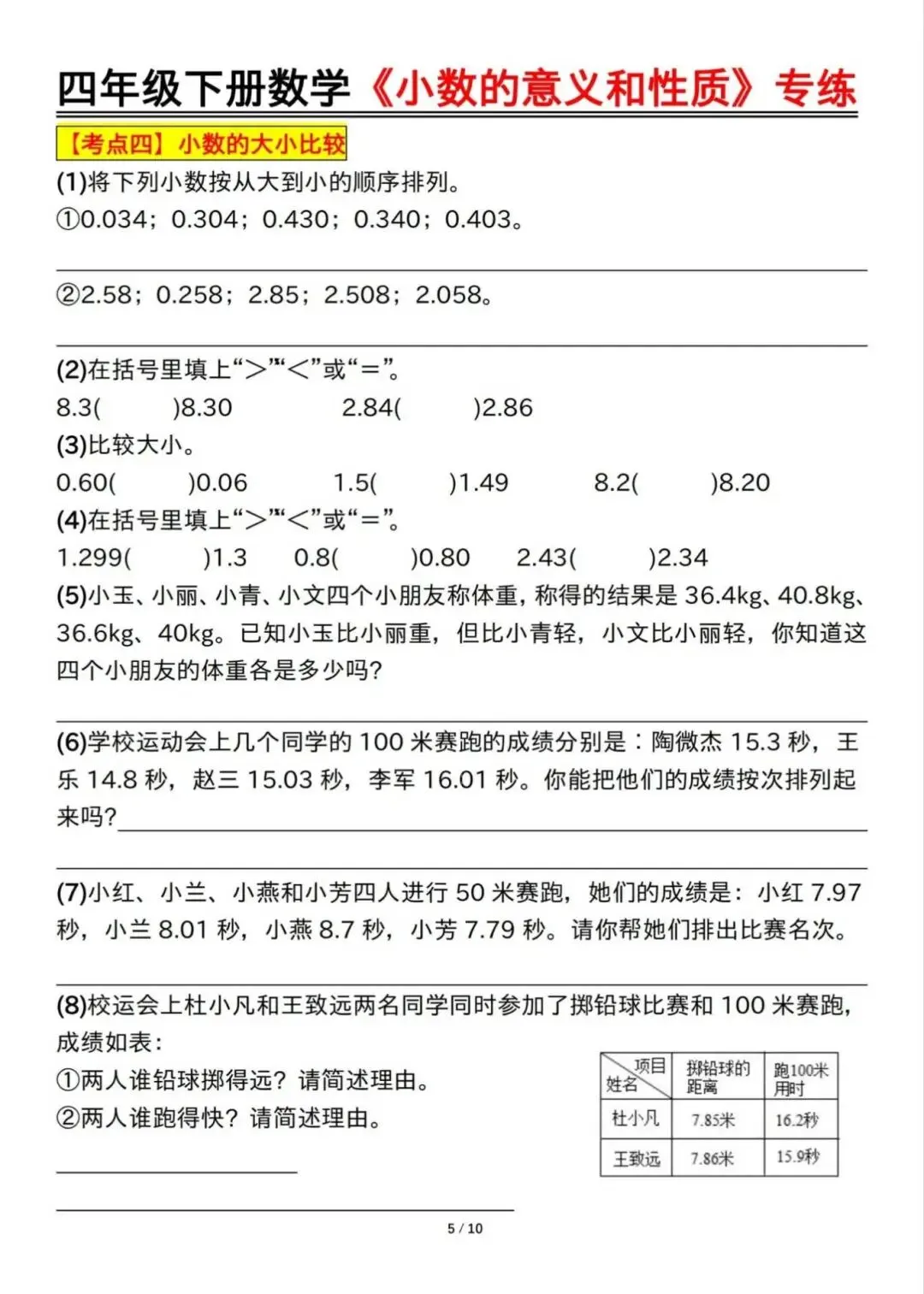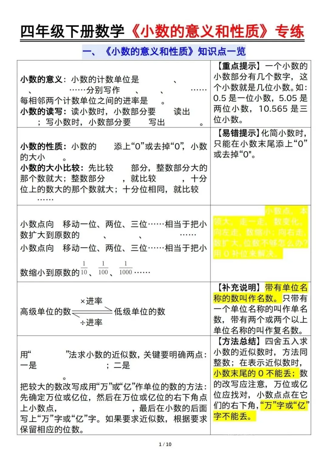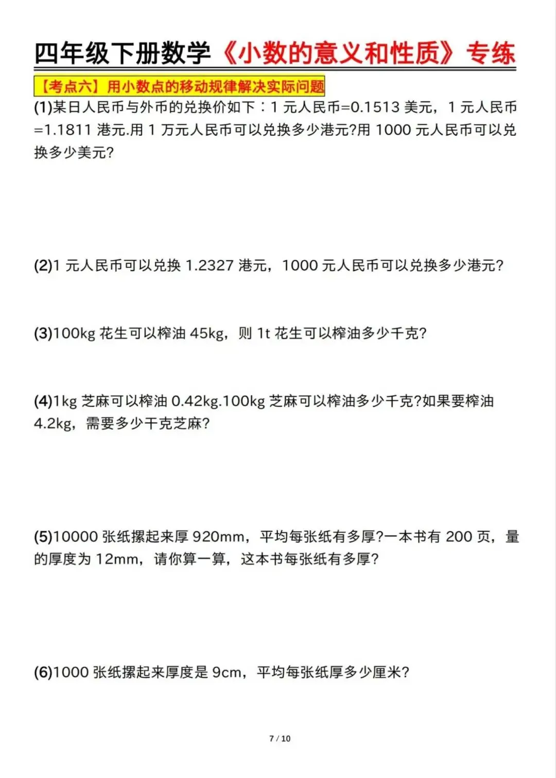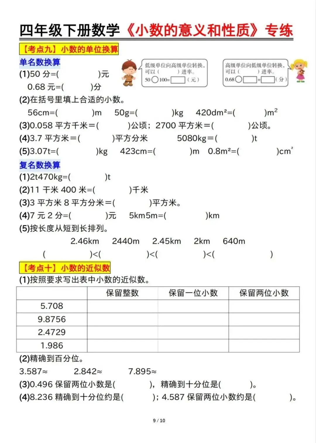 四年级下册数学小数的意义和性质专项训练,这份资料归类了本单元的常考重点题型,小数的读作、写作、小数的意义表示、比较大小、单位换算、化简、小数点的移动、口算等9大类型,家长可辅导孩子时,对本单元的知识点练一练,巩固基础