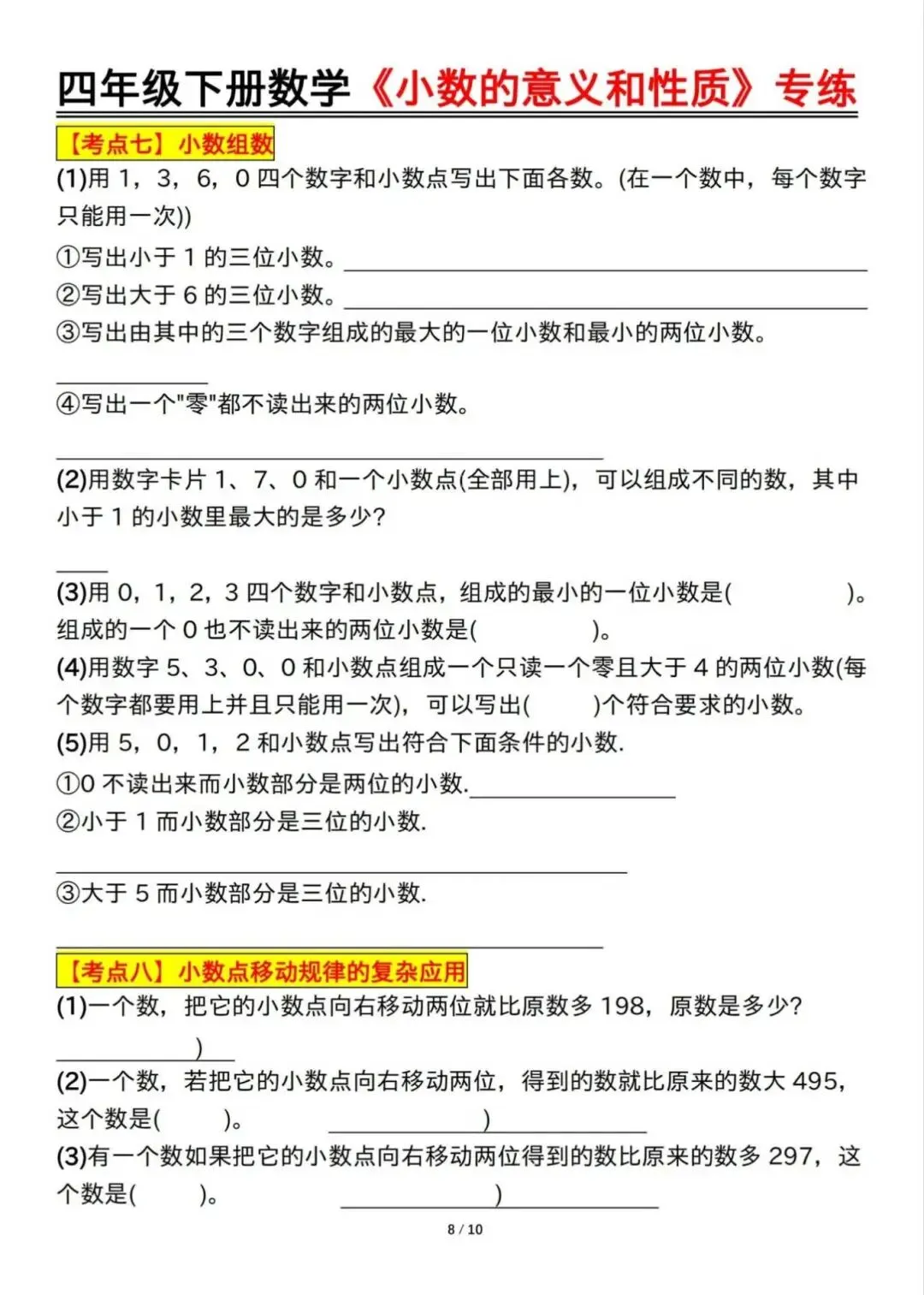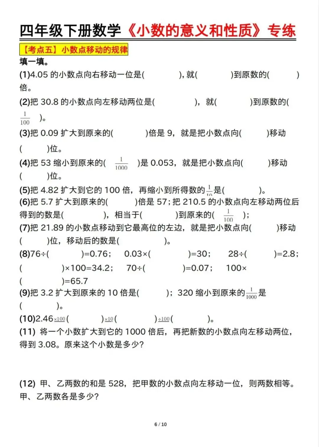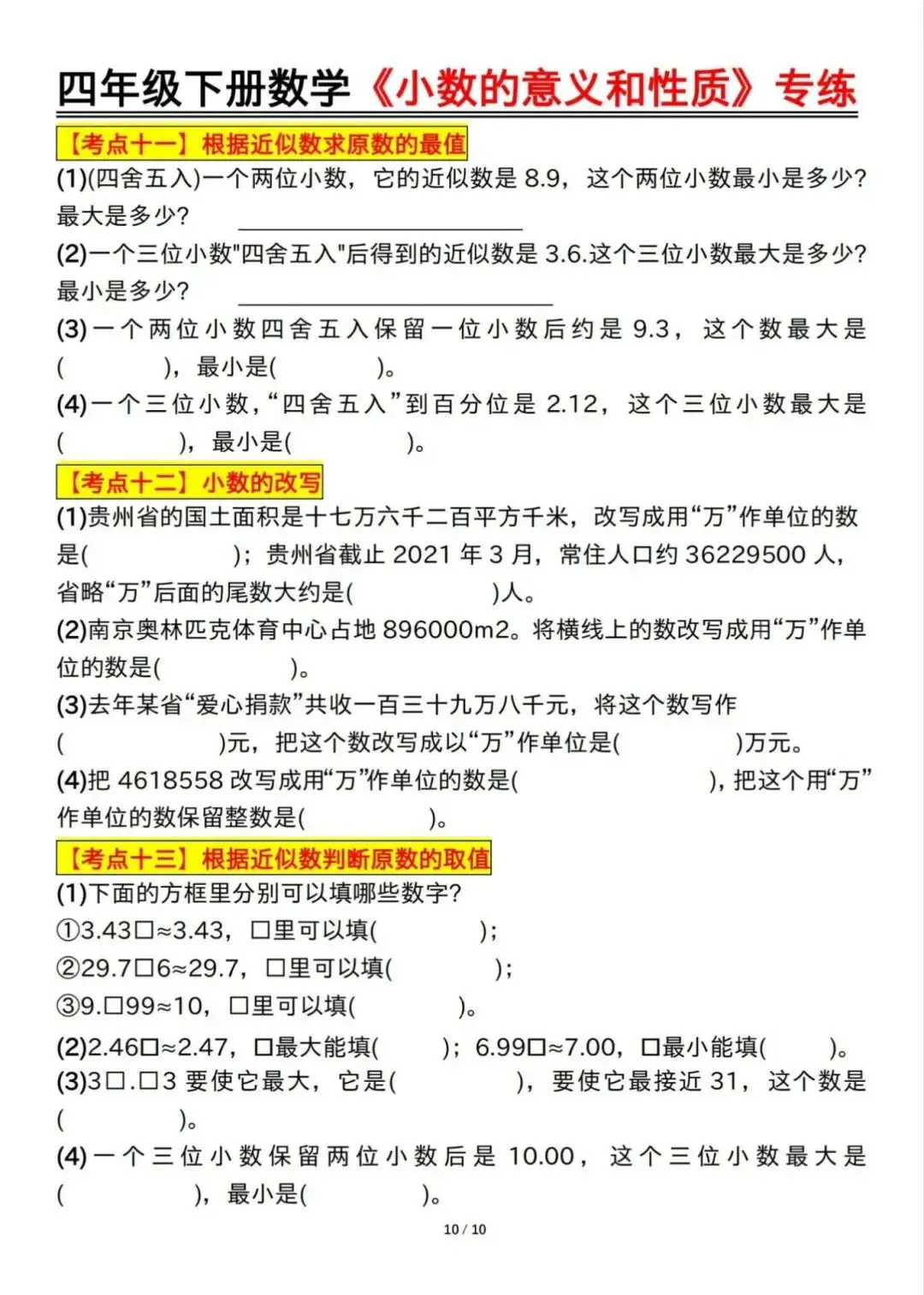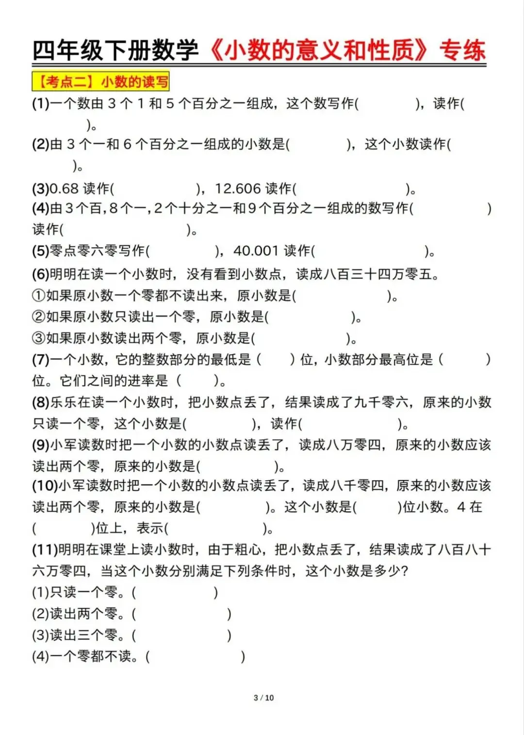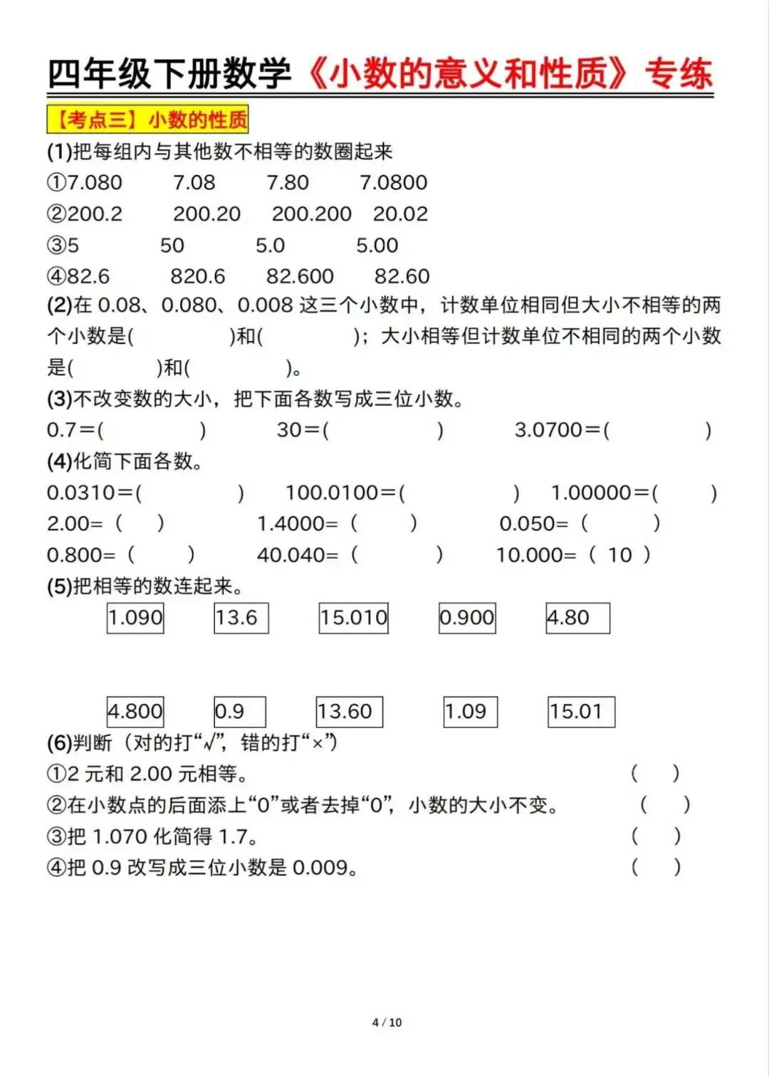 四年级下册数学《小数的意义和性质》专练,电子版可下载打印