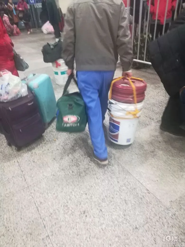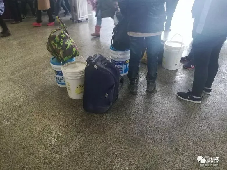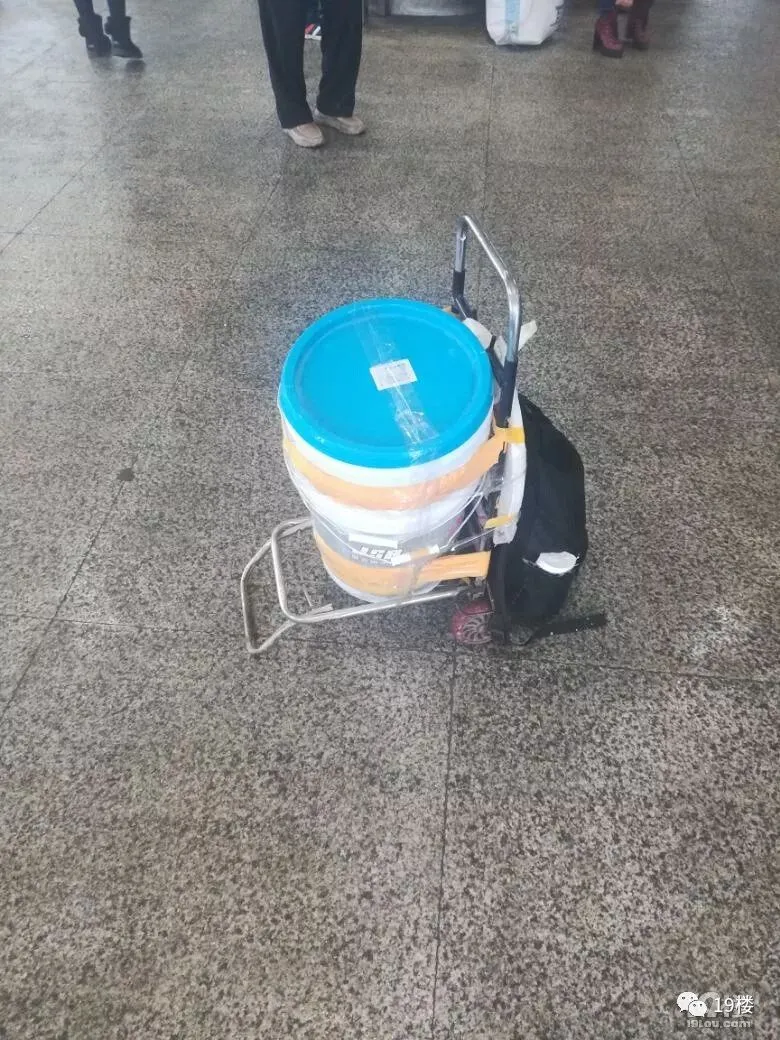 旁边那位师傅,一看也是工地上的,他绑在行李箱上的水平尺,应该是铺装瓷砖大理石的工具。他也带了三个涂料桶,其中一个桶上绑着一口高压锅。