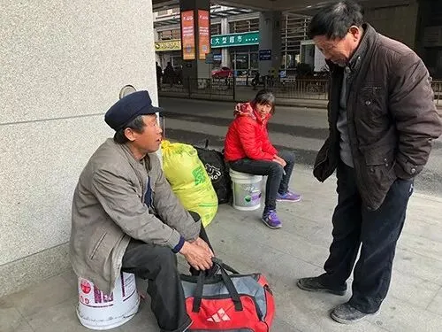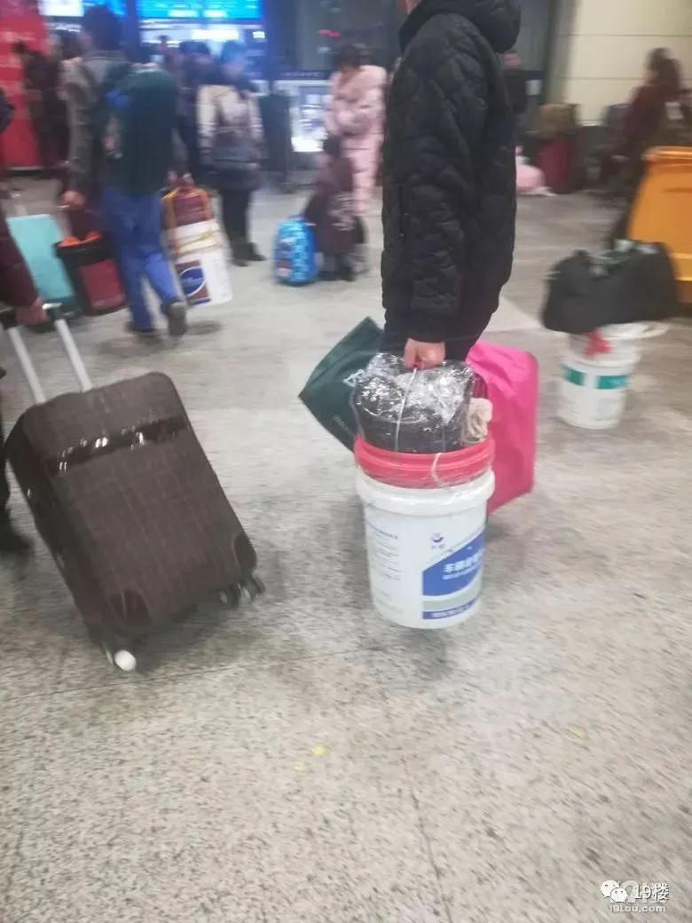 陈大姐旁边站着的,是河南老乡柴师傅,他行李箱上绑了一个红塑料桶,柴师傅说是他花13块钱买的,干净漂亮,但和涂料桶比,显得又脆又薄,根本不敢坐上去。