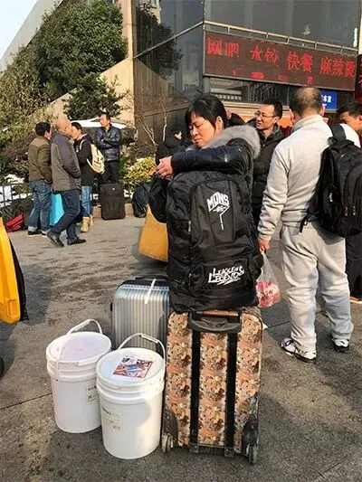 在湖州做童装生意的王大姐也带了两个涂料桶,她老家贵州遵义,两口子从湖州坐大巴来到杭州买火车票,如果买不到坐票,两个桶就是他们俩这一路的座位,不然站着回老家要31个小时!涂料桶里装满东西,王大姐好不容易打开一个桶盖给我看,里面有苹果、辣条和餐巾纸。