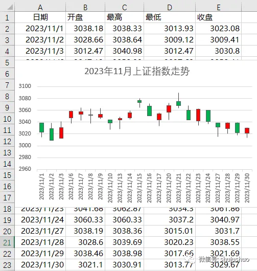 第二步,就是插入开盘-盘高-盘低-收盘股价图,调整跌柱线填充色为绿色,涨柱线为红色,就可以完成图表创建。有趣的事儿来了,如何去读这张报表呢?