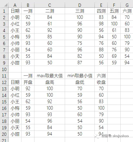 第一步仍然是准备图表数据。使用max和min函数提取出股价图需要的数据,不知道这俩函数咋用的,可以转函数系列查看使用说明。