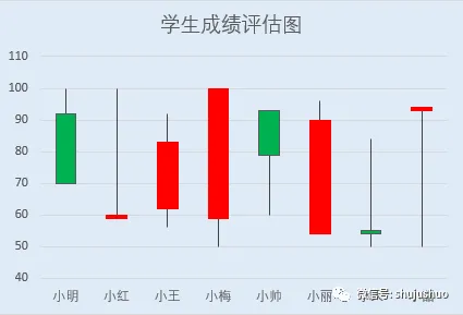 虽然叫做股价图,但除了炒股,它还可以做很多事,比如用来统计学生的成绩情况,制作一个学生成绩评估图。