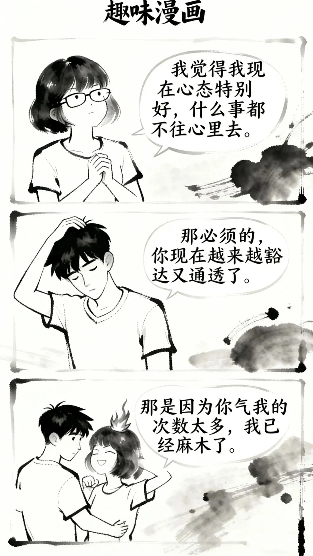 趣味漫画:老婆说:我觉得我现在心态特别好,什么事都不往心里去,老公说那必须的,你现在越来越豁达又通透了.