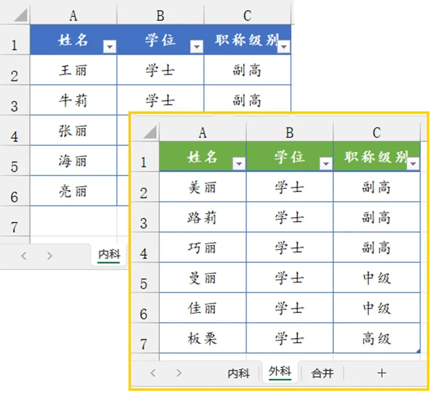 如下图,两个科室的人员名单分别存放在不同工作表中,现在要使用公式将这两份名单合并到一起。