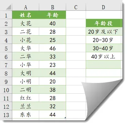 如下图所示,要根据D列的条件,统计各个年龄段的人数。