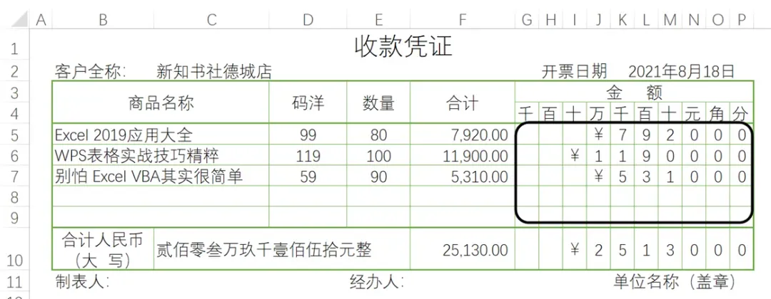 如下图所示,是一份模拟的收款凭证,其中F列为商品的合计金额,需要在G~P列实现金额数值分列显示,且在第一位数字之前添加人民币符号(¥)